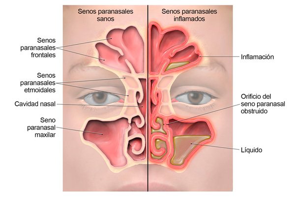 Estas cavidades generan mucosidades, ya que una de sus funciones es el filtrado del aire. Cuando se produce su inflamación los orificios por donde salen al exterior las secreciones se obstruyen y es por eso que se empieza a producir la acumulación del líquido en los senos.